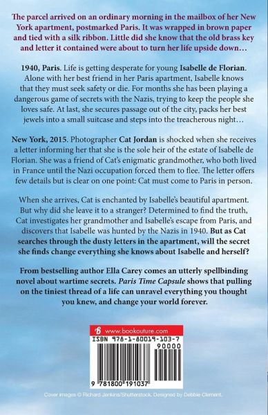 The parcel arrived on an ordinary morning in the mailbox of her New York apartment, postmarked Paris. It was wrapped in brown paper and tied with a silk ribbon. Little did she know that the old brass key and letter it contained were about to turn her life upside down... 1940, Paris. Life is getting desperate for young Isabelle de Florian. Alone with her best friend in her Paris apartment, Isabelle knows that they must seek safety or die. For months she has been playing a dangerous game of secrets with the Nazis, trying to keep the people she loves safe. At last, she secures passage out of the city, packs her best jewels into a small suitcase and steps into the treacherous night... New York, 2015. Photographer Cat Jordan is shocked when she receives a letter informing her that she is the sole heir of the estate of Isabelle de Florian. She was a friend of Cat's enigmatic grandmother, who both lived in France until the Nazi occupation forced them to flee. The letter offers few details but is clear on one point: Cat must come to Paris in person. When she arrives, Cat is enchanted by Isabelle's beautiful apartment. But why did she leave it to a stranger? Determined to find the truth, Cat investigates her grandmother and Isabelle's escape from Paris, and discovers that Isabelle was hunted by the Nazis in 1940. But as Cat searches through the dusty letters in the apartment, will the secret she finds change everything she knows about Isabelle and herself? From bestselling author Ella Carey comes an utterly spellbinding novel about wartime secrets. Paris Time Capsule shows that pulling on the tiniest thread of a life can unravel everything you thought you knew, and change your world forever.