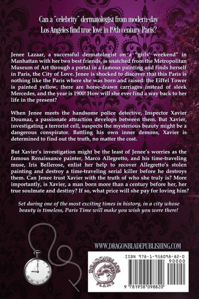 Can a "celebrity" dermatologist from modern-day Los Angeles find true love in 19th century Paris? Jenee Lazaar, a successful dermatologist on a "girls' weekend" in Manhattan with her two best friends, is snatched from the Metropolitan Museum of Art through a portal in a famous painting and finds herself in Paris, the City of Love. Jenee is shocked to discover that this Paris is nothing like the Paris where she was born and raised: the Eiffel Tower is painted yellow, there are horse-drawn carriages instead of sleek Mercedes, and the year is 1900! How will she ever find a way back to her life in the present? When Jenee meets the handsome police detective, Inspector Xavier Doumaz, a passionate attraction develops between them. But Xavier, investigating a terrorist cell, suspects the mysterious beauty might be a dangerous conspirator. Battling his own inner demons, Xavier is determined to find out the truth, no matter the cost. But Xavier's investigation might be the least of Jenee's worries as the famous Renaissance painter, Marco Allegretto, and his time-traveling muse, Iris Bellerose, enlist her help to recover Allegretto's stolen painting and destroy a time-traveling serial killer before he destroys them. Can Jenee trust Xavier with the truth of who she truly is? More importantly, is Xavier, a man born more than a century before her, her true soulmate and destiny? If so, what price will she pay for loving him? Set during one of the most exciting times in history, in a city whose beauty is timeless, Paris Time will make you wish you were there! Lost in Time London Time Paris Time Tuscan Time