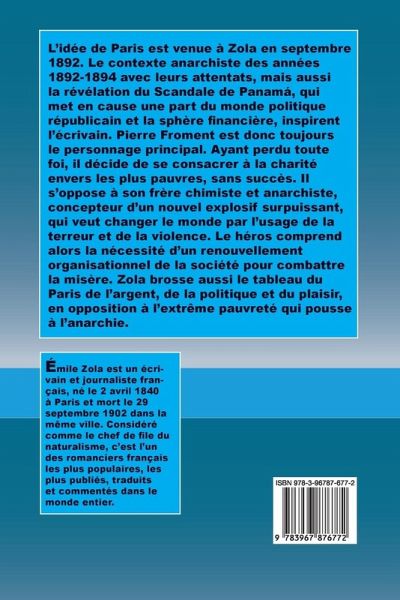 L'idée de Paris est venue à Zola en septembre 1892. Le contexte anarchiste des années 1892-1894 avec leurs attentats, mais aussi la révélation du Scandale de Panamá, qui met en cause une part du monde politique républicain et la sphère financière, inspirent l'écrivain. Pierre Froment est donc toujours le personnage principal. Ayant perdu toute foi, il décide de se consacrer à la charité envers les plus pauvres, sans succès. Il s'oppose à son frère chimiste et anarchiste, concepteur d'un nouvel explosif surpuissant, qui veut changer le monde par l'usage de la terreur et de la violence. Le héros comprend alors la nécessité d'un renouvellement organisationnel de la société pour combattre la misère. Zola brosse aussi le tableau du Paris de l'argent, de la politique et du plaisir, en opposition à l'extrême pauvreté qui pousse à l'anarchie.