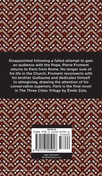 Paris (1898) is a novel by French author Émile Zola. Paris is the final installment in Zola's celebrated Three Cities Trilogy. Published toward the end of Zola's career, the trilogy is an ambitious, sweeping study of one man's struggle with faith in political, religious, and social life. Following his protagonist Abbé Pierre Froment, Zola provides a striking portrait of the soul of modern man in crisis with itself and with an ever-changing world. Paris finds Abbé Froment back in his home city, disheartened in his life and in his faith. Having failed in his quest to reform the Church, he turns his attention from institutional change to helping the poor and sick. As his reputation as an almsgiver grows, he draws the ire of his Church superiors, who are wary of his socialistic ideals. Regardless, Pierre dedicates himself to his subjects, taking in the poverty and destitution of a great city's slums and forgetting his former ambitions. When a near-death experience involving an anarchist bombing brings him back in touch with his estranged brother Guillaume, Froment begins to wonder whether his fate must rely on an institution unwilling, and perhaps unable, to change. In the thrilling conclusion to his Three Cities Trilogy, Zola explores the meaning of faith in a faithless world through the eyes of one good man. This edition of Émile Zola's Paris is a classic work of French literature reimagined for modern readers. Since our inception in 2020, Mint Editions has kept sustainability and innovation at the forefront of our mission. Each and every Mint Edition title gets a fresh, professionally typeset manuscript and a dazzling new cover, all while maintaining the integrity of the original book. With thousands of titles in our collection, we aim to spotlight diverse public domain works to help them find modern audiences. Mint Editions celebrates a breadth of literary works, curated from both canonical and overlooked classics from writers around the globe.