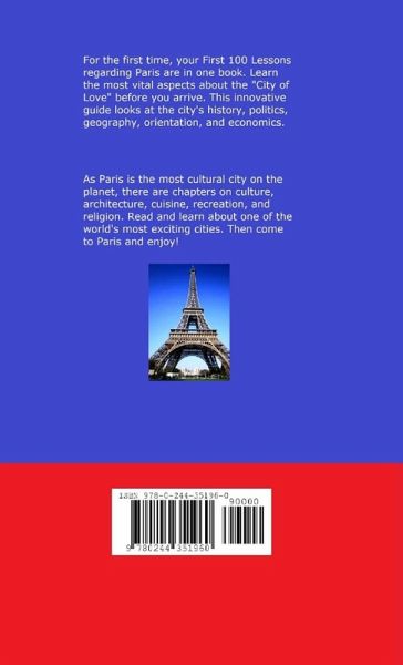 For the first time, your First 100 Lessons regarding the beautiful city of Paris are in one book. Learn about the "City of Lights" before you arrive. This innovative guide looks at the city's history, geography, politics, orientation, and economics. As Paris is the most cultural city on the planet, there are also chapters on culture, architecture, recreation, and religion. This travel guide helps you look at Paris from a new and interesting perspective. Learn about one of the world's most exciting cities. Then come to Paris to enjoy and learn even more!
