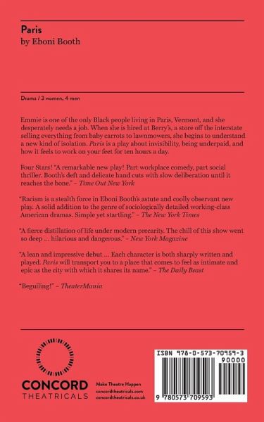 Emmie is one of the only Black people living in Paris, Vermont, and she desperately needs a job. When she is hired at Berry's, a store off the interstate selling everything from baby carrots to lawnmowers, she begins to understand a new kind of isolation. Paris is a play about invisibility, being underpaid, and how it feels to work on your feet for ten hours a day.