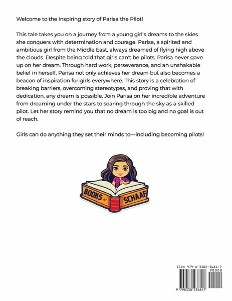 Welcome to the inspiring story of Parisa the Pilot! This tale takes you on a journey from a young girl's dreams to the skies she conquers with determination and courage. Parisa, a spirited and ambitious girl from the Middle East, always dreamed of flying high above the clouds. Despite being told that girls can't be pilots, Parisa never gave up on her dream. Through hard work, perseverance, and an unshakable belief in herself, Parisa not only achieves her dream but also becomes a beacon of inspiration for girls everywhere. This story is a celebration of breaking barriers, overcoming stereotypes, and proving that with dedication, any dream is possible. Join Parisa on her incredible adventure from dreaming under the stars to soaring through the sky as a skilled pilot. Let her story remind you that no dream is too big and no goal is out of reach. Girls can do anything they set their minds to-including becoming pilots!