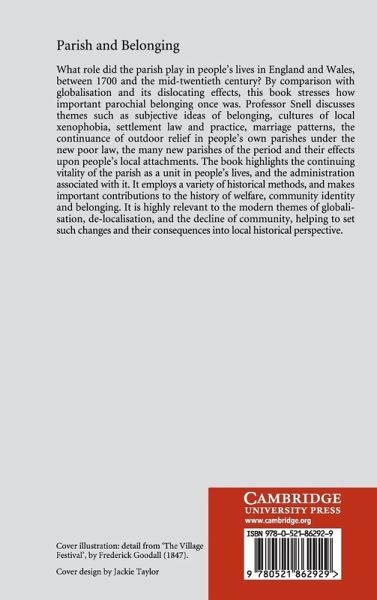 What role did the parish play in people's lives in England and Wales between 1700 and the mid-twentieth century? By comparison with globalisation and its dislocating effects, the book stresses how important parochial belonging once was. Professor Snell discusses themes such as settlement law and practice, marriage patterns, cultures of local xenophobia, the continuance of out-door relief in people's own parishes under the new poor law, the many new parishes of the period and their effects upon people's local attachments. The book highlights the continuing vitality of the parish as a unit in people's lives, and the administration associated with it. It employs a variety of historical methods, and makes important contributions to the history of welfare, community identity and belonging. It is highly relevant to the modern themes of globalisation, de-localisation, and the decline of community, helping to set such changes and their consequences into local historical perspective.