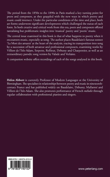 The central issue examined in this book is that of what happens to poetry when it encounters music, especially as song. The author places Baudelaire's famous sonnet «La Mort des amants» at the heart of the analysis, tracing its transposition into song by a succession of both amateur and professional composers, examining works by Villiers de l'Isle-Adam, Serpette, Rollinat, Debussy and Charpentier, as well as an extraordinary parodic song version by Valade and Verlaine.