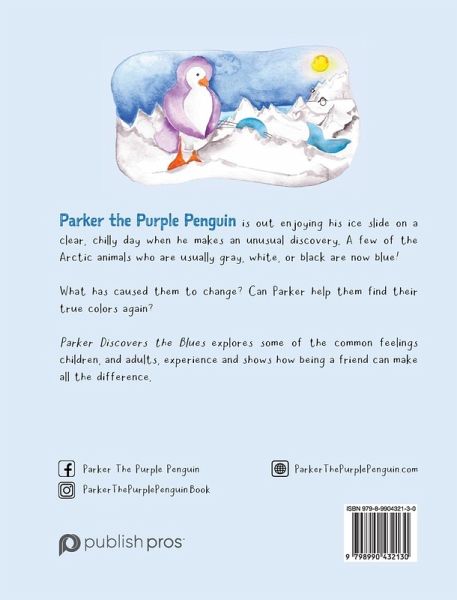 2025 Purple Dragonfly Book Award Readers Favorite 5-Star Review Your favorite purple penguin is back! Only this time there's a new hue in the spotlight. Parker the purple penguin is out enjoying the day when he makes an unusual discovery. A few of the Arctic animals who are usually gray, white, or black are now blue. What has caused them to change colors? Can Parker help them find their true colors again? Parker Discovers the Blues explores some of the common feelings children-and adults-experience and shows how being a friend can make all the difference.Perfect for discussions with preschoolers and elementary school kids about being nervous, worried, or sad. Helps young kids understand how to support someone who may be having these feelings. Beautiful hand-painted watercolor illustrations. Discussion questions included.
