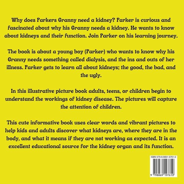 Why does Parkers Granny need a kidney? Parker is curious and fascinated about why his Granny needs a kidney. He wants to know about kidneys and their function. Join Parker on his learning journey. The book is about a young boy (Parker) who wants to know why his Granny needs something called dialysis, and the ins and outs of her illness. Parker gets to learn all about kidneys; the good, the bad, and the ugly. In this illustrative picture book adults, teens, or children begin to understand the workings of kidney disease. The pictures will capture the attention of children. This cute informative book uses clear words and vibrant pictures to help kids and adults discover what kidneys are, where they are in the body, and what it means if they are not working as expected. It is an excellent educational source for the kidney organ and its function. What's Inside:Note Activity Page Questions Page Kidney Drawing Activity