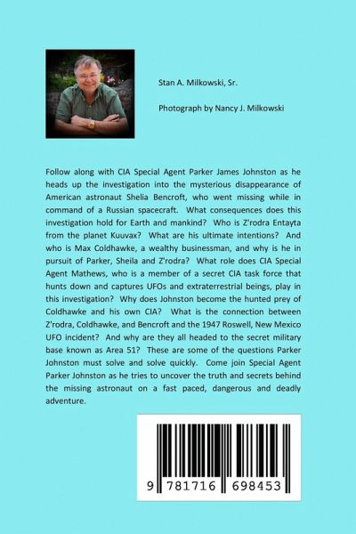 Follow along with CIA Special Agent Parker James Johnston as he heads up the investigation into the mysterious disappearance of American astronaut Shelia Bencroft, while in command of a Russian spacecraft returning to Earth. What consequences does this investigation hold for Earth and mankind? Who is Z'rodra Entayta from the planet Kuuvax? What are his ultimate intentions? And who is Max Coldhawke, a wealthy businessman, and why is he in pursuit of Parker, Sheila and Z'rodra? What role does CIA Special Agent Mathews, who is a member of a secret CIA task force that hunts down and captures UFOs and extraterrestrial beings, play in this investigation? Why does Johnston become the hunted prey of Mathews and Coldhawke? What is the connection between Z'rodra, Coldhawke, and Bencroft with the 1947 Roswell, New Mexico UFO incident? And why are they all headed to the secret military base known as Area 51. These are some of the questions Johnston must solve and solve quickly. Come join Special Agent Parker Johnston as he tries to uncover the truth and secrets behind the missing astronaut on a fast paced, dangerous and deadly adventure.