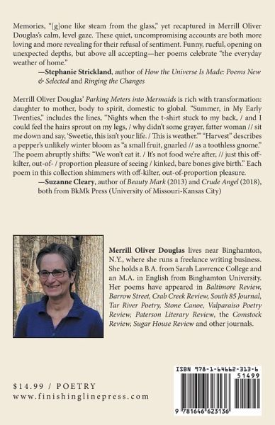 Poems of growing up and growing older, holding on and letting go, paying tribute while always paying attention to the sidewalk cracks and the small, itchy places. Memories, "[g]one like steam from the glass," yet recaptured in Merrill Oliver Douglas's calm, level gaze. These quiet, uncompromising accounts are both more loving and more revealing for their refusal of sentiment. Funny, rueful, opening on unexpected depths, but above all accepting-her poems celebrate "the everyday weather of home." -Stephanie Strickland, author of How the Universe Is Made: Poems New & Selected and Ringing the Changes Merrill Oliver Douglas' Parking Meters into Mermaids is rich with transformation: daughter to mother, body to spirit, domestic to global. "Summer, in My Early Twenties," includes the lines, "Nights when the t-shirt stuck to my back, / and I could feel the hairs sprout on my legs, / why didn't some grayer, fatter woman // sit me down and say, 'Sweetie, this isn't your life. / This is weather.'" "Harvest" describes a pepper's unlikely winter bloom as "a small fruit, gnarled // as a toothless gnome." The poem abruptly shifts: "We won't eat it. / It's not food we're after, // just this off-kilter, out-of- / proportion pleasure of seeing / kinked, bare bones give birth." Each poem in this collection shimmers with off-kilter, out-of-proportion pleasure. -Suzanne Cleary, author of Beauty Mark (2013) and Crude Angel (2018), both from BkMk Press (University of Missouri-Kansas City)