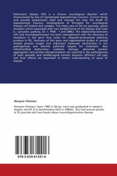 Parkinson's disease (PD) is a chronic neurological disorder which characterized by loss of nigrostriatal dopaminergic neurons. Current drugs only provide symptomatic relief and manage the stop the death of dopaminergic neurons. Developments of therapies for neurological diseases are limited and complex. The many case of PD are sporadic, genes mutation which associated with rare familial forms of the disease that code - synuclein, parking, DJ- 1, PINK - 1 and LRRK2. The relationship between UPS and neurodegeneration has been strengthened with the discovery of mutations in the gene that codes for ubiquitin-proteasome pathway proteins in PD. Discovery of this gene and experimental studies in animal models provide insight into important molecular mechanisms in the pathogenesis and identify potential targets for treatment. Also mitochondrial dysfunction, oxidative damage, abnormal protein aggregation and protein phosphorylation are essential in the pathogenesis of both sporadic and familial.signal transfer between different cell type and their effects are important to better understanding of cause of disease.