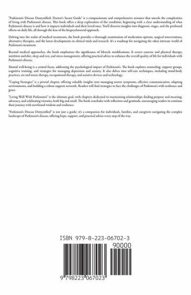 "Parkinson's Disease Demystified: Doctor's Secret Guide" is a compassionate and comprehensive resource that unveils the complexities of living with Parkinson's disease. This book offers a deep exploration of the condition, beginning with a clear understanding of what Parkinson's disease is and how it impacts individuals and their loved ones. You'll discover insights into diagnosis, stages, and the profound effects on daily life, all through the lens of the biopsychosocial approach. Delving into the realm of medical treatments, the book provides a thorough examination of medication options, surgical interventions, alternative therapies, and the latest developments in clinical trials and research. It's a roadmap for navigating the often intricate world of Parkinson's treatment. Beyond medical approaches, the book emphasizes the significance of lifestyle modifications. It covers exercise and physical therapy, nutrition and diet, sleep and rest, and stress management, offering practical advice to enhance the overall quality of life for individuals with Parkinson's disease. Mental well-being is a central focus, addressing the psychological impact of Parkinson's. The book explores counseling, support groups, cognitive training, and strategies for managing depression and anxiety. It also delves into self-care techniques, including mind-body practices, art and music therapy, occupational therapy, and assistive devices and technology. "Coping Strategies" is a pivotal chapter, offering valuable insights into managing motor symptoms, effective communication, adapting environments, and building a robust support network. Readers will find strategies to face the challenges of Parkinson's with resilience and grace. "Living Well With Parkinson's" is the ultimate goal, with chapters dedicated to maintaining relationships, finding purpose and meaning, advocacy, and celebrating victories, both big and small. The book concludes with reflection and gratitude, encouraging readers to continue their journey with newfound wisdom and resilience. "Parkinson's Disease Demystified" is not just a guide; it's a companion for individuals, families, and caregivers navigating the complex landscape of Parkinson's disease, offering hope, support, and practical advice every step of the way.
