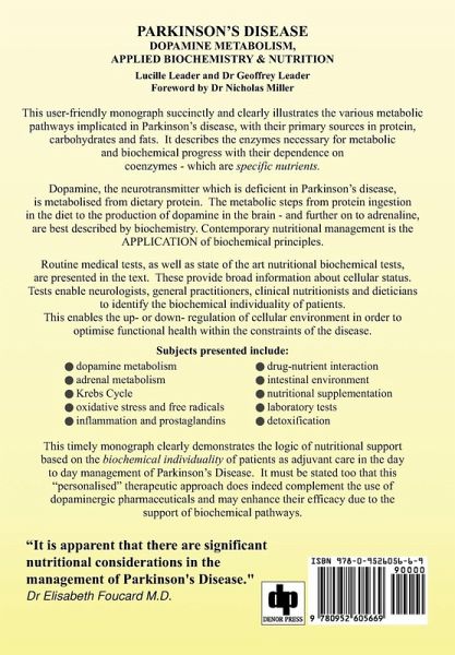 PARKINSON'S DISEASE DOPAMINE METABOLISM, APPLIED BIOCHEMISTRY & NUTRITION Authors: Lucille Leader and Dr Geoffrey Leader Foreword: by Dr Nicholas Miller This user-friendly monograph illustrates the various metabolic pathways implicated in Parkinson's disease, with their primary sources in protein, carbohydrates and fats. It describes the enzymes necessary for metabolic and biochemical progress with their dependence on coenzymes - which are specific nutrients. The text demonstrates that concomitant with dopaminergic pharmaceutical supplementation, dynamic support of the individual's biochemical, metabolic and nutritional status should be considered as essential adjuvant therapy during the degenerative journey. The aim is to optimise potential cellular and general functional health within the constraints of the disease. Dopamine, the neurotransmitter which is deficient in Parkinson's disease, is metabolised from dietary protein. The metabolic steps from protein ingestion in the diet to the production of dopamine in the brain - and further on to adrenaline, are best described by biochemistry. Contemporary nutritional management is the APPLICATION of biochemical principles. Medical tests as well as state of the art nutritional biochemical tests are presented which enable the medical and nutritional professions to up- or down- regulate the individual cellular environment. Subjects presented include: ¿ dopamine metabolism ¿ adrenal metabolism ¿ inflammation and prostaglandins ¿ oxidative stress and free radicals ¿ intestinal environment ¿ Krebs Cycle and cell energy ¿ drug-nutrient interaction ¿ nutritional supplements ¿ detoxification ¿ laboratory tests This "personalised" therapeutic approach does indeed complement the use of dopaminergic pharmaceuticals and may enhance their efficacy due to the support of biochemical pathways.