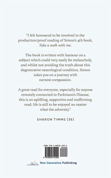 "I felt honoured to be involved in the production/proof reading of Simon's 4th book, Parkinson's - Take a Walk With Me. The book is written with humour on a subject which could very easily be melancholy, and whilst not avoiding the truth about this degenerative neurological condition, Simon takes you on a journey with earnest compassion. A great read for everyone, especially for anyone remotely connected to Parkinson's Disease, this is an uplifting, supportive and reaffirming read; life is still to be enjoyed no matter what the adversity." - Sharon Timms (35)