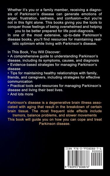Whether it's you or a family member, receiving a diagnosis of Parkinson's disease can generate emotions of anger, frustration, sadness, and confusion-but you're not in this fight alone. This books giving you the tools to conquer those feelings of being overwhelmed and helping you to be better prepared for life post-diagnosis. In one of the most extensive, up-to-date Parkinson's disease books, you'll find resources for maintaining realistic optimism while living with Parkinson's disease. In This Book, You Will Discover:A comprehensive guide to understanding Parkinson's disease, including its symptoms, causes, and diagnosis Evidence-based strategies for managing Parkinson's disease Tips for maintaining healthy relationships with family, friends, and caregivers, including strategies for effective communication Practical tools and resources for managing Parkinson's disease and living their best lives. And lots more Parkinson's disease is a degenerative brain illness associated with aging that result in the breakdown of certain brain tissue. The most frequent side effects include tremors, balance problems, and slower movements This book will guide you on how you can cope and treat Parkinson disease.
