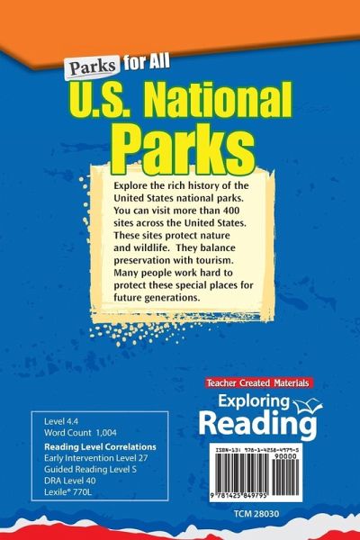 Explore the history of America's national parks. The parks balance conservation with tourism. Nature and wildlife are protected there. The next time you visit a park site, think of the efforts of the people who saved these special places for future generations. This nonfiction book includes important text features such as a glossary, index, and table of contents to engage students in reading as they develop their comprehension, vocabulary, and literacy skills. The Reader's Guide and culminating activity direct students back to the text as they develop their higher-order thinking skills. Check It Out! provides resources for additional reading and learning. With TIME For Kids content, this book aligns with national and state standards and will keep grade 4 students engaged in learning.