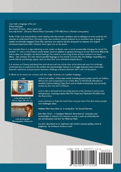 This extraordinary work deals with the human condition and its dialogue of what could be the understanding of love. The poet uses modern musical notation as an inventive way to keep the reader emotionally engaged. For example there is a sign to the reader to flutter over a word, or the symbol ' >' over a word means accent letter, word or syllable or gesture forcing us to 'see' the word differently and so alter our thoughts via feelings. Some fifty notations are used to aid this along and to express the original emotional experience (the 'erlebnis') which gave rise to the poem.