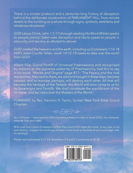 There is a sinister protocol and a centuries-long history of deception behind the deliberate construction of PARLIAMENT HILL, from minute details to the building as a whole through signs, symbols, emblems and idolatrous structures! GOD (Jesus Christ, John 1:1-17) through reading His Word (Bible) speaks to people plainly! Satan uses deception and lies to speak to people in obscurity and secrecy as alluded to above! GOD created the heavens and the earth, including us (Colossians 1:16-18 AMP). Satan (Lucifer fallen, Isaiah 14:12-15) seeks to take over the world from GOD! Albert Pike, Grand Pontiff of Universal Freemasonry and recognized by masons as the supreme authority of Freemasonry, had this to say in his book, page 817: "The Papacy and the rival monarchies, they said to them, are sold and bought in these days, become corrupt, and to-morrow, perhaps, will destroy each other. All that will become the heritage of the Temple: the World will soon come to us for its Sovereigns and Pontiffs. We shall constitute the equilibrium of the Universe, and be rulers over the Masters of the World." FORWARD by Rev. Harmon R. Taylor, former New York State Grand Chaplain