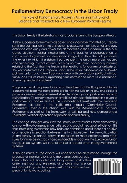 The Lisbon Treaty is the latest and most crucial reform to the European Union. As the successor to the much-debated and innovative Constitution, it represents the culmination of the unification process, for it aims to simultaneously enhance efficiency and cover the democratic deficit inherent in the outdated decisionmaking mechanisms of the past, as a consequence of excessive enlargement and deepened integration. Thus, the first question is the extent to which the Lisbon Treaty renders the Union more democratic and according to what criteria that may be evaluated. Another question is related to the fact that the Treaty is the result of a fundamental debate on the very nature of the European Union: Is the latter to become an authentic political union or a mere free-trade area with secondary political attributions? And will its internal operating rules correspond more to a parliamentary or a presidential regime? The present work proposes to focus on the claim that the European Union as a polity shall become more democratic with the Lisbon Treaty, and seeks to provide answers using representative democracy and parliamentarianism as indicators. To achieve such an ambitious aim, special attention is given to parliamentary bodies, first at the supranational level with the European Parliament as part of the institutional triangle (Commission-Council-Parliament), then at the internal level with the Member States' national Parliaments as part of the framework of existing and new competences (oversight, vertical separation of powers and subsidiarity). The changes brought about by the Lisbon Treaty towards more democracy are not without consequence to its second proclaimed goal, efficiency. It is thus interesting to examine how both are combined and if there is a positive or a negative interaction between the two. Moreover, the very articulation of the sensitive balance between measures for more efficiency and measures for more democracy has a noticeable impact on the European Union as a political system. Will it function like a federal or an intergovernmental system? Although much of the above will undeniably be determined through the practice of the institutions and the overall political equilibrium that will be achieved, the present work offers useful methods and elements of analysis that are an indispensable guide to anyone with an interest in European Union law and politics.