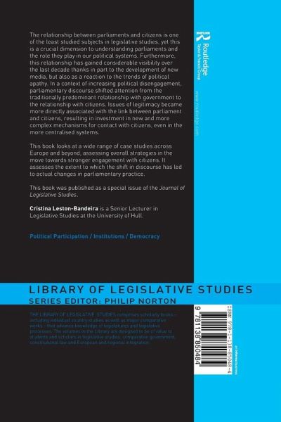 The relationship between parliaments and citizens is one of the least studied subjects in legislative studies, yet this is a crucial dimension to understand parliaments and the role they play in our political systems. Furthermore, this relationship has gained considerable visibility over the last decade thanks in part to the development of new media, but also as a reaction to the trends of political apathy. In a context of increasing political disengagement, parliamentary discourse shifted attention from the traditionally predominant relationship with government to the relationship with citizens. Issues of legitimacy became more directly associated with the link between parliament and citizens, resulting in investment in new and more complex mechanisms for contact with citizens, even in the more centralised systems. This book looks at a wide range of case studies across Europe and beyond, assessing overall strategies in the move towards stronger engagement with citizens. It assesses the extent to which the shift in discourse has led to actual changes in parliamentary practice. This book was published as a special issue of the Journal of Legislative Studies.