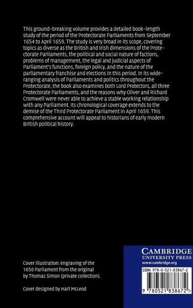 This ground-breaking volume fills a major historiographical gap by providing the first detailed book-length study of the period of the Cromwellian Protectorate from December 1653 to May 1659. The study is very broad in its scope, covering topics as diverse as the British and Irish dimensions of the Protectorate Parliaments, the political and social nature of factions, problems of management, the legal and judicial aspects of Parliament's functions, foreign policy and the nature of the parliamentary franchise and elections in this period. In its wide-ranging analysis of Parliaments and politics throughout the Protectorate the book also examines both Lord Protectors, all three Protectorate Parliaments and the reasons why Oliver and Richard Cromwell were never able to achieve a stable working relationship with any Parliament. Its chronological coverage extends to the demise of the Protectorate in May 1659. This comprehensive account will appeal to historians of early modern British political history.