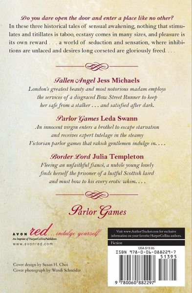Do you dare open the door and enter a place like no other? In these three historical tales of sensual awakening, nothing that stimulates and titillates is taboo, ecstasy comes in many sizes, and pleasure is its own reward . . . a world of seduction and sensation, where inhibitions are unlaced and desires long corseted are gloriously freed. . . . Fallen Angel Jess Michaels London's greatest beauty and most notorious madam employs the services of a disgraced Bow Street Runner to keep her safe from a stalker . . . and satisfied after dark. Parlor Games Leda Swann An innocent virgin enters a brothel to escape starvation and receives expert tutelage in the steamy Victorian parlor games that rakish gentlemen indulge in. . . . Border Lord Julia Templeton Fleeing an unfaithful fiancé, a nubile young lovely finds herself the prisoner of a lustful Scottish laird and must bow to his every erotic whim. . . .