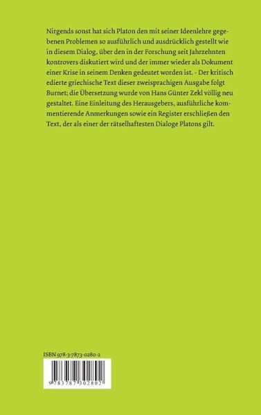Nirgends sonst hat sich Platon den mit seiner Ideenlehre gegebenen Problemen so ausführlich und ausdrücklich gestellt wie in diesem Dialog, über den in der Forschung seit Jahrzehnten kontrovers diskutiert wird und der immer wieder als Dokument einer Krise in seinem Denken gedeutet worden ist. - Der kritisch edierte griechische Text dieser zweisprachigen Ausgabe folgt Burnet; die Übersetzung wurde von Hans Günter Zekl völlig neu gestaltet. Eine Einleitung des Herausgebers, ausführliche kommentierende Anmerkungen sowie ein Register erschließen den Text, der als einer der rätselhaftesten Dialoge Platons gilt.