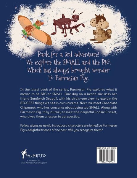 The Parmesan Pig Books Series once again tells a story with social-emotional learning (SEL) themes at its core. In Book 1, characters overcame challenging emotions and found their inner HAPPY with the support of a mindful friend. In Book 2, Parmesan Pig had the social awareness to appreciate and support the NEEDS and WANTS of others. Book 3 explores a theme of perspective. Characters new and old will discover that BIG vs. SMALL all depends on one's point of view. Meet Sandwich Seagull, with a birds-eye view, and Cookie Cricket, an expert at math. Both characters use the world around them to educate a very curious Parmesan Pig and her sweetest friend Chocolate Chipmunk. Additionally, the lessons effectively help anxious characters gain confidence and self-assurance. "Sandwich Seagull inspired With all of these facts. He is as full of perspective, As his mouth is with snacks." Why readers will love Parmesan Pig: Big, Small, and Beyond:Curiosity: Parmesan Pig seeks to understand why the BIGGEST things in the universe appear so SMALL from where she stands. Uplifting: Readers will see how a character experiencing insecurity will discover a new perspective, enabling her to feel comfortable with her size. And beyond that, Parmesan Pig assures this friend that she measures others purely by the kindness they show. Stimulating. Each subsequent book in the series will see brand new characters joined by characters from previous books. Readers will feel their love for this fascinating, growing universe expand with every page. Re-readability. Readers' understanding of the lessons within the book will continue to strengthen. Additionally, subtle illustrations will be rewarding to recognize during future readings.... "That's Guacamole Goose in the background!" Don't miss the chance to join the adventure as the series continues here in Book 3: Parmesan Pig: Small, Big, and Beyond.