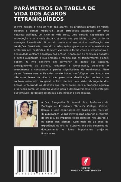 O livro explora o ciclo de vida dos ácaros, as principais pragas de várias culturas e plantas medicinais. Estes artrópodes adaptáveis têm uma natureza polífaga, um ciclo de vida curto, uma elevada capacidade de reprodução e uma resistência crescente aos pesticidas, o que os torna ameaças formidáveis. O estudo destaca a sua rápida proliferação em condições favoráveis, levando a infestações graves e a uma resistência acelerada aos pesticidas. Também examina a forma como a temperatura e a humidade moldam a biologia dos ácaros, sendo que as condições quentes e secas aumentam a sua ameaça à medida que as temperaturas globais sobem. O livro descreve em pormenor os danos que causam, enfraquecendo as plantas, reduzindo a fotossíntese, atrasando o crescimento e conduzindo a perdas significativas de rendimento. Além disso, fornece uma análise das caraterísticas morfológicas dos ácaros em diferentes fases da vida, crucial para uma identificação precisa e um controlo orientado. No geral, o livro oferece uma visão abrangente dos ácaros, enfatizando os desafios que representam para a produção agrícola e servindo como um recurso valioso para o desenvolvimento de estratégias sustentáveis de gestão de pragas para mitigar o seu impacto.