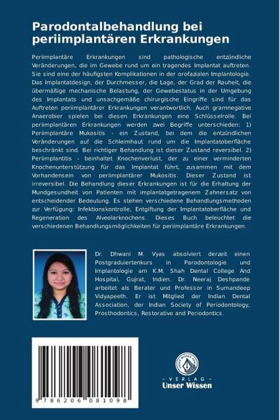 Periimplantäre Erkrankungen sind pathologische entzündliche Veränderungen, die im Gewebe rund um ein tragendes Implantat auftreten. Sie sind eine der häufigsten Komplikationen in der orofazialen Implantologie. Das Implantatdesign, der Durchmesser, die Lage, der Grad der Rauheit, die übermäßige mechanische Belastung, der Gewebestatus in der Umgebung des Implantats und unsachgemäße chirurgische Eingriffe sind für das Auftreten periimplantärer Erkrankungen verantwortlich. Auch gramnegative Anaerobier spielen bei diesen Erkrankungen eine Schlüsselrolle. Bei periimplantären Erkrankungen werden zwei Begriffe unterschieden: 1) Periimplantäre Mukositis - ein Zustand, bei dem die entzündlichen Veränderungen auf die Schleimhaut rund um die Implantatoberfläche beschränkt sind. Bei richtiger Behandlung ist dieser Zustand reversibel. 2) Periimplantitis - beinhaltet Knochenverlust, der zu einer verminderten Knochenunterstützung für das Implantat führt, zusammen mit dem Vorhandensein von periimplantärer Mukositis. Dieser Zustand ist irreversibel. Die Behandlung dieser Erkrankungen ist für die Erhaltung der Mundgesundheit von Patienten mit implantatgetragenem Zahnersatz von entscheidender Bedeutung. Es stehen verschiedene Behandlungsmethoden zur Verfügung: Infektionskontrolle, Entgiftung der Implantatoberfläche und Regeneration des Alveolarknochens. Dieses Buch beleuchtet die verschiedenen Behandlungsmöglichkeiten für periimplantäre Erkrankungen.