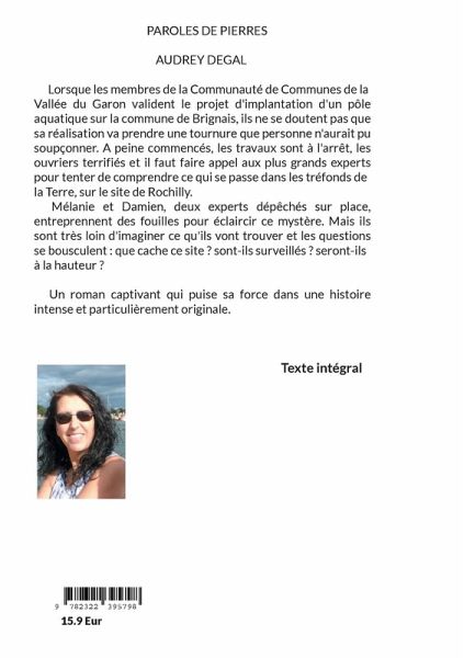 Docteure ès lettres de littérature médiévale française, Audrey Degal est aujourd'hui professeure de lettres modernes en lycée. Un suspense haletant caractérise son écriture. Les lecteurs, de plus en plus nombreux, sont irrésistiblement entraînés de pages en pages vers un dénouement toujours fascinant. Elle a obtenu le premier prix du policier à Attignat en 2017. Si Paroles de pierres est son 5e roman, elle est aussi l'autrice de : - Le Manuscrit venu d'ailleurs - La Muraille des âmes - Destinations étranges - Le Lien. Son 6e roman, déjà écrit, s'intitulera Rencontre avec l'impossible (sortie probable fin 2022). Actuellement, Audrey Degal se consacre à l'écriture d'un nouveau roman policier dont l'action se passe le long de la côte méditerranéenne. Il saura, comme les précédents, vous séduire et vous tenir en haleine jusqu'au dernier moment. Retrouvez l'actualité d'Audrey Degal sur son site officiel : deshistoirespourvous.com mais aussi sur sa chaîne YouTube.