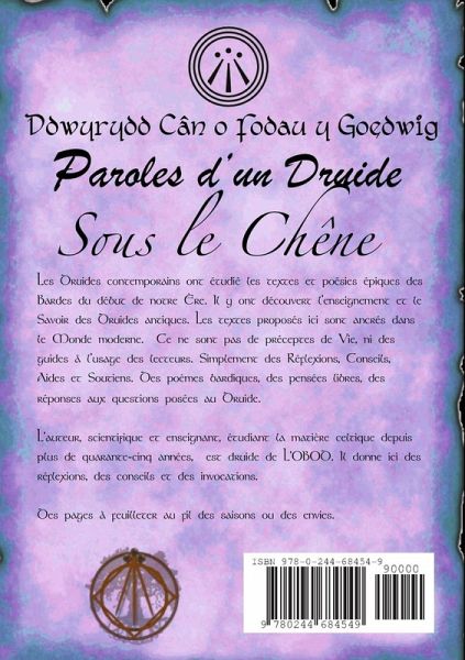 Les Druides contemporains ont étudié les textes et poésies épiques des Bardes du début de notre Ère. Il y ont découvert l'enseignement et le Savoir des Druides antiques. Les textes proposés ici sont ancrés dans le Monde moderne. Ce ne sont pas de préceptes de Vie, ni des guides à l'usage des lecteurs. Simplement des Réflexions, Conseils, Aides et Soutiens. Des poèmes bardiques,, des pensées libres, des réponses aux questions posées au Druide. L'auteur, scientifique et enseignant, étudiant la matière celtique depuis plus de quarante-cinq années, est druide de L'OBOD. Il donne ici des réflexions, des conseils et des invocations.