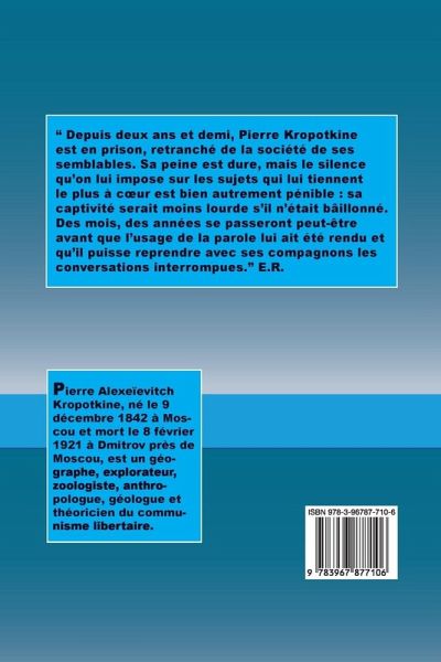 " Depuis deux ans et demi, Pierre Kropotkine est en prison, retranché de la société de ses semblables. Sa peine est dure, mais le silence qu'on lui impose sur les sujets qui lui tiennent le plus à c¿ur est bien autrement pénible : sa captivité serait moins lourde s'il n'était bâillonné. Des mois, des années se passeront peut-être avant que l'usage de la parole lui ait été rendu et qu'il puisse reprendre avec ses compagnons les conversations interrompues." E.R.