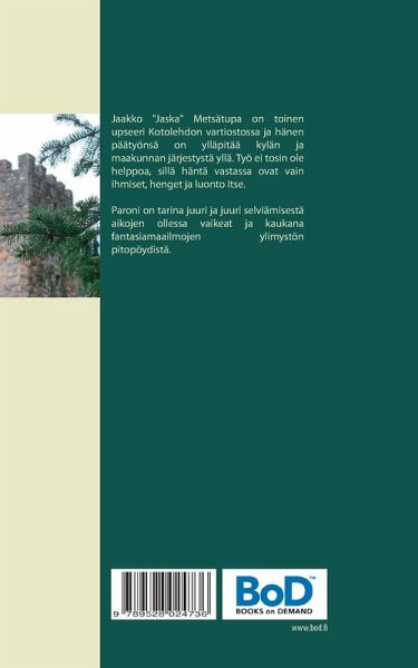 Jaakko "Jaska" Metsätupa on toinen upseeri Kotolehdon vartiostossa ja hänen päätyönsä on ylläpitää kylän ja maakunnan järjestystä yllä. Työ ei tosin ole helppoa, sillä häntä vastassa ovat vain ihmiset, henget ja luonto itse. Paroni on tarina juuri ja juuri selviämisestä aikojen ollessa vaikeat ja kaukana fantasiamaailmojen ylimystön pitopöydistä.