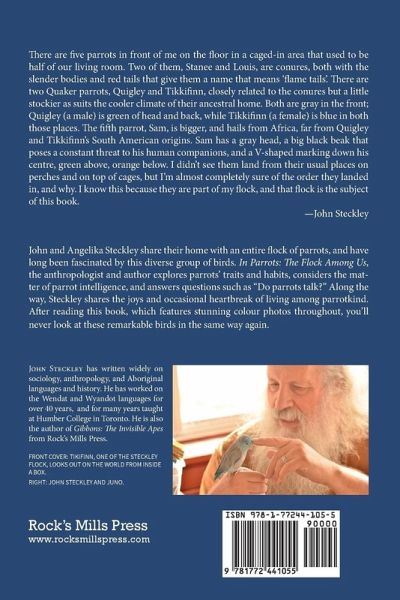 "There are five parrots in front of me on the floor in a caged-in area that used to be half of our living room. Two of them, Stanee and Louis, are conures, both with the slender bodies and red tails that give them a name that means ‘flame tails’. There are two Quaker parrots, Quigley and Tikkifinn, closely related to the conures but a little stockier as suits the cooler climate of their ancestral home. Both are gray in the front; Quigley (a male) is green of head and back, while Tikkifinn (a female) is blue in both those places. The fifth parrot, Sam, is bigger, and hails from Africa, far from Quigley and Tikkifinn’s South American origins. Sam has a gray head, a big black beak that poses a constant threat to his human companions, and a V-shaped marking down his centre, green above, orange below. I didn’t see them land from their usual places on perches and on top of cages, but I’m almost completely sure of the order they landed in, and why. I know this because they are part of my flock, and that flock is the subject of this book." —From the book John and Angelika Steckley share their home with an entire flock of parrots, and have long been fascinated by this diverse group of birds. In Parrots: The Flock Among Us, the anthropologist and author explores parrots’ traits and habits, considers the matter of parrot intelligence, and answers questions such as "Do parrots talk?" Along the way, Steckley shares the joys and occasional heartbreak of living among parrotkind. After reading this book, you’ll never look at these remarkable birds in the same way again.