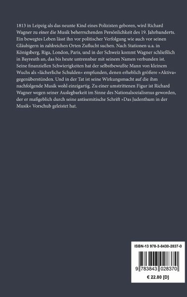 1813 in Leipzig als das neunte Kind eines Polizisten geboren, wird Richard Wagner zu einer die Musik beherrschenden Persönlichkeit des 19. Jahrhunderts. Ein bewegtes Leben lässt ihn vor politischer Verfolgung wie auch vor seinen Gläubigern in zahlreichen Orten Zuflucht suchen. Nach Stationen u.a. in Königsberg, Riga, London, Paris, und in der Schweiz kommt Wagner schließlich in Bayreuth an, das bis heute untrennbar mit seinem Namen verbunden ist. Seine finanziellen Schwierigkeiten hat der selbstbewußte Mann von kleinem Wuchs als "lächerliche Schulden" empfunden, denen erheblich größere "Aktiva" gegenüberstünden. Und in der Tat ist seine Wirkungsmacht auf die ihm nachfolgende Musik wohl einzigartig.