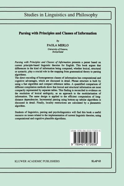 Parsing with Principles and Classes of Information presents a parser based on current principle-based linguistic theories for English. It argues that differences in the kind of information being computed, whether lexical, structural or syntactic, play a crucial role in the mapping from grammatical theory to parsing algorithms.