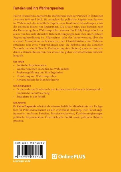 Katrin Praprotnik analysiert die Wahlversprechen der Parteien in Österreich zwischen 1990 und 2013. Sie betrachtet das politische Angebot von Parteien im Wahlkampf, das inhaltliche Ergebnis von Koalitionsverhandlungen sowie die politische Bilanz von Regierungen. Die Studie zeigt, dass Parteien nach der Umsetzung ihrer Wahlversprechen streben. Ihr Erfolg hängt jedoch vor allem von den institutionellen Rahmenbedingungen (wie etwa einer späteren Regierungsbeteiligung im Allgemeinen oder der Verantwortung über das relevante Ministerium im Besonderen), den Charakteristika eines Wahlversprechens (wie etwa Versprechungen über die Beibehaltung des aktuellen Zustands und damit über die Verhinderung einer Reform) sowie den vorhandenen externen Ressourcen (wie etwa einer guten wirtschaftlichen Entwicklung) ab.