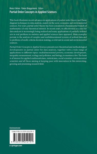 TThis book illustrates recent advances in applications of partial order theory and Hasse diagram techniques to data analysis, mainly in the socio-economic and environmental sciences. For years, partial order theory has been considered a fundamental branch of mathematics of only theoretical interest. In recent years, its effectiveness as a tool for data analysis is increasingly being realized and many applications of partially ordered sets to real problems in statistics and applied sciences have appeared. Main examples pertain to the analysis of complex and multidimensional systems of ordinal data and to problems of multi-criteria decision making, so relevant in social and environmental sciences. Partial Order Concepts in Applied Sciences presents new theoretical and methodological developments in partial order for data analysis, together with a wide range of applications to different topics: multidimensional poverty, economic development, inequality measurement, ecology and pollution, and biology, to mention a few. The book is of interest for applied mathematicians, statisticians, social scientists, environmental scientists and all those aiming at keeping pace with innovation in this interesting, growing and promising research field.