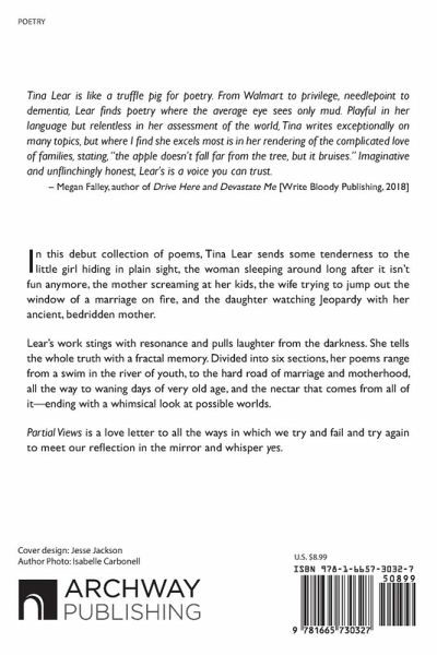 In this debut collection of poems, Tina Lear sends some tenderness to the little girl hiding in plain sight, the woman sleeping around long after it isn't fun anymore, the mother screaming at her kids, the wife trying to jump out the window of a marriage on fire, and the daughter watching Jeopardy with her ancient, bedridden mother. Lear's work stings with resonance and pulls laughter from the darkness. She tells the whole truth with a fractal memory. Divided into six sections, her poems range from a swim in the river of youth, to the hard road of marriage and motherhood, all the way to waning days of very old age, and the nectar that comes from all of it-ending with a whimsical look at possible worlds. Partial Views is a love letter to all the ways in which we try and fail and try again to meet our reflection in the mirror and whisper yes.