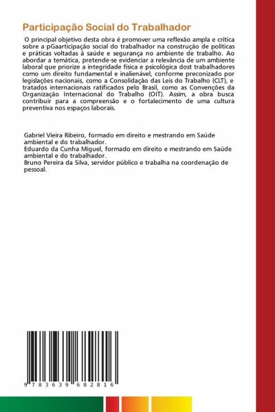 O principal objetivo desta obra é promover uma reflexão ampla e crítica sobre a pGaarticipação social do trabalhador na construção de políticas e práticas voltadas à saúde e segurança no ambiente de trabalho. Ao abordar a temática, pretende-se evidenciar a relevância de um ambiente laboral que priorize a integridade física e psicológica dost trabalhadores como um direito fundamental e inalienável, conforme preconizado por legislações nacionais, como a Consolidação das Leis do Trabalho (CLT), e tratados internacionais ratificados pelo Brasil, como as Convenções da Organização Internacional do Trabalho (OIT). Assim, a obra busca contribuir para a compreensão e o fortalecimento de uma cultura preventiva nos espaços laborais.