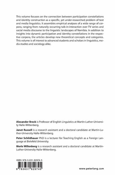 This volume focuses on the connection between participation constellations and identity construction as a specific, yet under-researched problem of text and media linguistics. It assembles empirical analyses of a wide range of corpora, ranging from naturally occurring talk-in-interaction over TV series and social media discourse to the linguistic landscapes of Namibia. In addition to insights into dynamic participation and identity constellations in the respective corpora, the articles develop new theoretical concepts and categories. This volume is of interest to advanced students and scholars in linguistics, media studies and sociology alike.