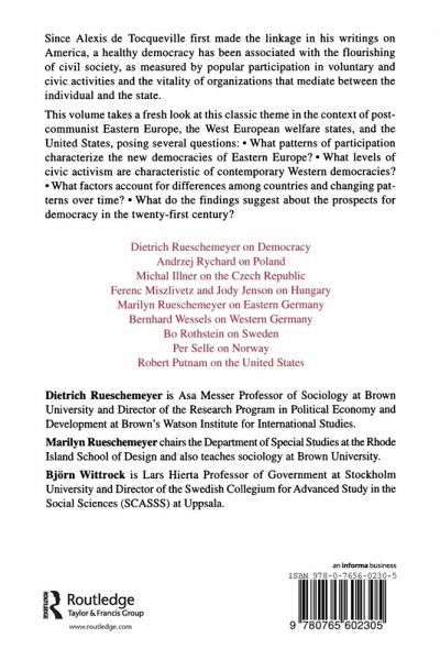 Since Alexis de Tocqueville first made the linkage in his writings on America, a healthy democracy has been associated with the flourishing of civil society, as measured by popular participation in voluntary and civic activities and the vitality of organizations that mediate between the individual and the state. This volume takes a fresh look at this classic theme in the context of post-communist Eastern Europe, the West European welfare states and the United States, asking: what patterns of participation characterize the new democracies of Eastern Europe?; what levels of civic activism are characteristic of contemporary Western democracies?; what factors account for differences among countries and changing patterns over time?; and what do findings suggest about the prospects for democracy in the 21st century?