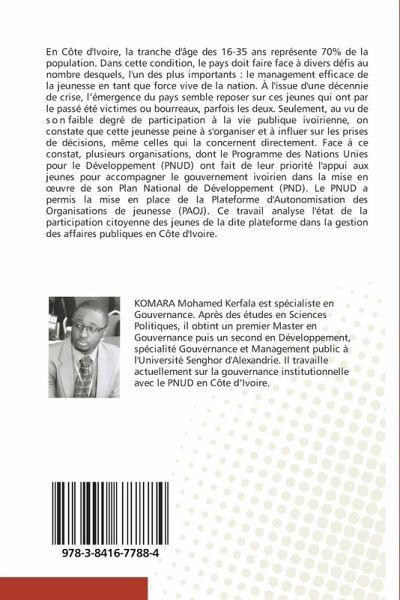 En Côte d'Ivoire, la tranche d'âge des 16-35 ans représente 70% de la population. Dans cette condition, le pays doit faire face à divers défis au nombre desquels, l'un des plus importants : le management efficace de la jeunesse en tant que force vive de la nation. À l'issue d'une décennie de crise, l'émergence du pays semble reposer sur ces jeunes qui ont par le passé été victimes ou bourreaux, parfois les deux. Seulement, au vu de son faible degré de participation à la vie publique ivoirienne, on constate que cette jeunesse peine à s'organiser et à influer sur les prises de décisions, même celles qui la concernent directement. Face à ce constat, plusieurs organisations, dont le Programme des Nations Unies pour le Développement (PNUD) ont fait de leur priorité l'appui aux jeunes pour accompagner le gouvernement ivoirien dans la mise en oeuvre de son Plan National de Développement (PND). Le PNUD a permis la mise en place de la Plateforme d'Autonomisation des Organisations de jeunesse (PAOJ). Ce travail analyse l'état de la participation citoyenne des jeunes de la dite plateforme dans la gestion des affaires publiques en Côte d'Ivoire.