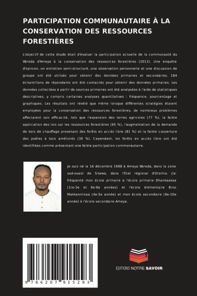 L'objectif de cette étude était d'évaluer la participation actuelle de la communauté du Woreda d'Ameya à la conservation des ressources forestières (2013). Une enquête d'opinion, un entretien semi-structuré, une observation personnelle et une discussion de groupe ont été utilisés pour obtenir des données primaires et secondaires. 184 échantillons de répondants ont été contactés pour obtenir des données primaires. Les données collectées à partir de sources primaires ont été analysées à l'aide de statistiques descriptives, y compris certaines analyses quantitatives : fréquence, pourcentage et graphiques. Les résultats ont révélé que même lorsque différentes stratégies étaient employées pour la conservation des ressources forestières, de nombreux problèmes affectaient son efficacité, tels que l'expansion des terres agricoles (77 %), la faible application des lois sur les ressources forestières (65 %), l'augmentation de la demande de bois de chauffage provenant des forêts en accès libre (81 %) et la faible couverture des poêles à bois améliorés (30 %). Cependant, les forêts en accès libre ont été identifiées comme présentant une faible participation communautaire.