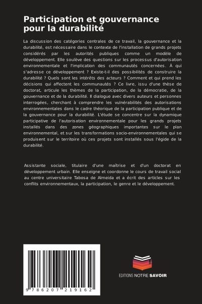 La discussion des catégories centrales de ce travail, la gouvernance et la durabilité, est nécessaire dans le contexte de l'installation de grands projets considérés par les autorités publiques comme un modèle de développement. Elle soulève des questions sur les processus d'autorisation environnementale et l'implication des communautés concernées. À qui s'adresse ce développement ? Existe-t-il des possibilités de construire la durabilité ? Quels sont les intérêts des acteurs ? Comment et qui prend les décisions qui affectent les communautés ? Ce livre, issu d'une thèse de doctorat, articule les thèmes de la participation, de la démocratie, de la gouvernance et de la durabilité. Il dialogue avec divers auteurs et personnes interrogées, cherchant à comprendre les vulnérabilités des autorisations environnementales dans le cadre théorique de la participation publique et de la gouvernance pour la durabilité. L'étude se concentre sur la dynamique participative de l'autorisation environnementale pour les grands projets installés dans des zones géographiques importantes sur le plan environnemental, et sur les transformations socio-environnementales qui se produisent sur le territoire où ces projets sont installés sous l'égide de la durabilité.