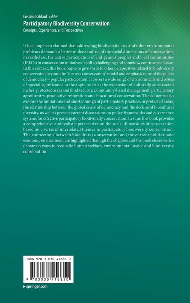 It has long been claimed that addressing biodiversity loss and other environmental problems demands a better understanding of the social dimensions of conservation; nevertheless, the active participation of indigenous peoples and local communities (IPLCs) in conservation initiatives is still a challenging and somehow controversial issue. In this context, this book hopes to give voice to other perspectives related to biodiversity conservation beyond the "fortress conservation" model and emphasize one of the pillars of democracy - popular participation. It covers a wide range of environments and issues of special significance to the topic, such as the expansion of culturally constructed niches, protected areas and food security, community-based management, participatory agroforestry, productive restoration and biocultural conservation. The contents also explore the limitations and shortcomings of participatory practices in protected areas, the relationship between the global crisis ofdemocracy and the decline of biocultural diversity, as well as present current discussions on policy frameworks and governance systems for effective participatory biodiversity conservation. In sum, this book provides a comprehensive and realistic perspective on the social dimensions of conservation based on a series of interrelated themes in participatory biodiversity conservation. The connections between biocultural conservation and the current political and economic environment are highlighted through the chapters and the book closes with a debate on ways to reconcile human welfare, environmental justice and biodiversity conservation.