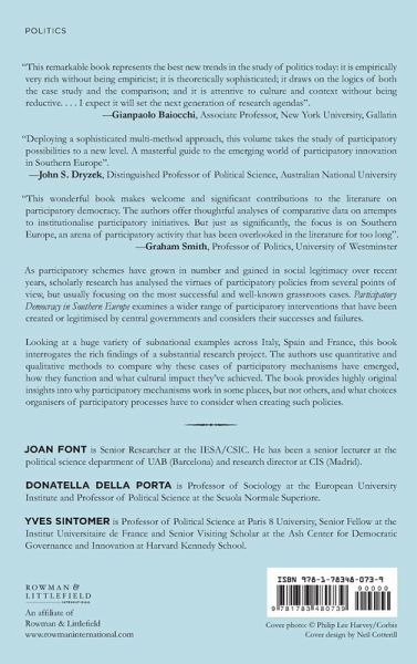 Joan Font is Senior Researcher at the IESA/CSIC working on citizen participation in public policies. He has been a senior lecturer at the Political Science department of UAB (Barcelona) and research director at CIS (Madrid). He has published in many journals including European Journal of Political Research, International Journal of Urban and Regional Research, Public Administration, Third World politics Regional & Federal Studies or South European Society and politics. Donatella della Porta is Professor of Sociology at the European University Institute. Her recent publications include: Meeting Democracy (CUP, 2013); Clandestine Political Violence (CUP, 2013), Can Democracy be Saved (Polity, 2013), Mobilizing on the Extreme Right (OUP, 2012); Social Movements and Europeanization (OUP, 2009; (ed.) Another Europe (Routledge, 2009); and (ed.) Democracy in Social Movements (Palgrave, 2009). Yves Sintomer is Professor of Political Science at Paris 8 University, Senior Fellow at the Institut Universitaire de France, and Associate Researcher at Neuchâtel University and Marc Bloch Centre (Humboldt University Berlin/CNRS). He has studied and taught in Harvard, Frankfurt/Main, Complutense-Madrid, Lausanne (Switzerland), UCL (Belgian), Universidad del Pais Vasco, Catania (Italy). He has been Deputy Director of the Marc Bloch Center (Berlin). His recent publications include Petite histoire de l'expérimentation démocratique. Tirage au sort et politique d'Athènes à nos jours. (La Découverte, 2011). The book has 10 additional contributors, affiliated with diverse Southern European universities and research institutions.