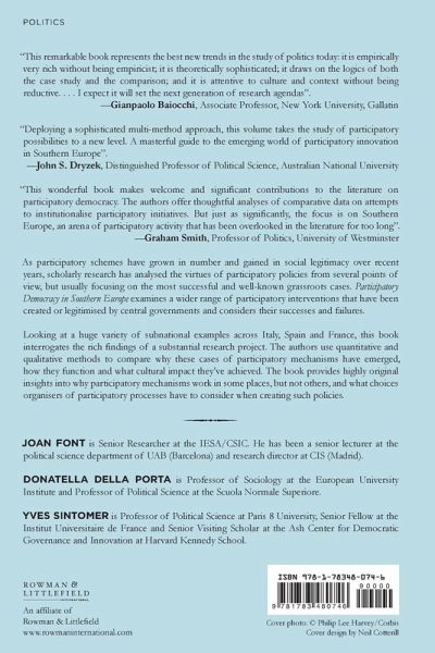 Joan Font is Senior Researcher at the IESA/CSIC working on citizen participation in public policies. He has been a senior lecturer at the Political Science department of UAB (Barcelona) and research director at CIS (Madrid). He has published in many journals including European Journal of Political Research, International Journal of Urban and Regional Research, Public Administration, Third World politics Regional & Federal Studies or South European Society and politics. Donatella della Porta is Professor of Sociology at the European University Institute. Her recent publications include: Meeting Democracy (CUP, 2013); Clandestine Political Violence (CUP, 2013), Can Democracy be Saved (Polity, 2013), Mobilizing on the Extreme Right (OUP, 2012); Social Movements and Europeanization (OUP, 2009; (ed.) Another Europe (Routledge, 2009); and (ed.) Democracy in Social Movements (Palgrave, 2009). Yves Sintomer is Professor of Political Science at Paris 8 University, Senior Fellow at the Institut Universitaire de France, and Associate Researcher at Neuchâtel University and Marc Bloch Centre (Humboldt University Berlin/CNRS). He has studied and taught in Harvard, Frankfurt/Main, Complutense-Madrid, Lausanne (Switzerland), UCL (Belgian), Universidad del Pais Vasco, Catania (Italy). He has been Deputy Director of the Marc Bloch Center (Berlin). His recent publications include Petite histoire de l'expérimentation démocratique. Tirage au sort et politique d'Athènes à nos jours. (La Découverte, 2011). The book has 10 additional contributors, affiliated with diverse Southern European universities and research institutions.