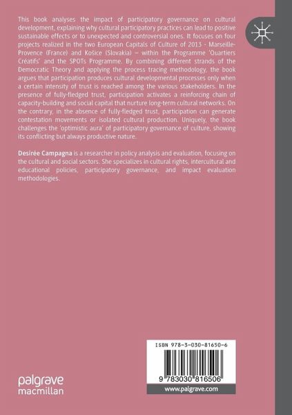 This book analyses the impact of participatory governance on cultural development, explaining why cultural participatory practices can lead to positive sustainable effects or to unexpected and controversial ones. It focuses on four projects realized in the two European Capitals of Culture of 2013 - Marseille-Provence (France) and Kosice (Slovakia) - within the Programme 'Quartiers Créatifs' and the SPOTs Programme. By combining different strands of the Democratic Theory and applying the process tracing methodology, the book argues that participation produces cultural developmental processes only when a certain intensity of trust is reached among the various stakeholders. In the presence of fully-fledged trust, participation activates a reinforcing chain of capacity-building and social capital that nurture long-term cultural networks. On the contrary, in the absence of fully-fledged trust, participation can generate contestation movements or isolated cultural production. Uniquely,the book challenges the 'optimistic aura' of participatory governance of culture, showing its conflicting but always productive nature.