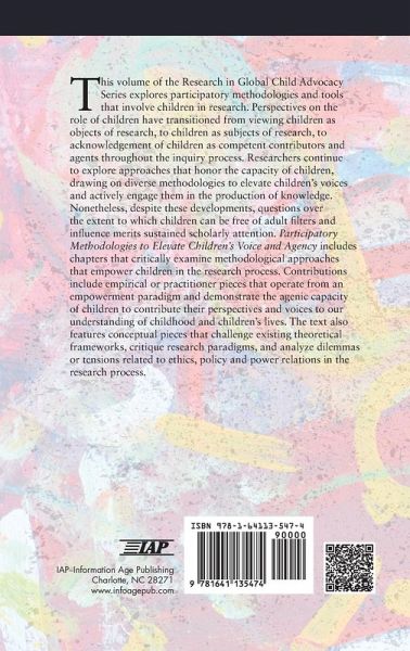 This volume of the Research in Global Child Advocacy Series explores participatory methodologies and tools that involve children in research. Perspectives on the role of children have transitioned from viewing children as objects of research, to children as subjects of research, to acknowledgement of children as competent contributors and agents throughout the inquiry process. Researchers continue to explore approaches that honor the capacity of children, drawing on diverse methodologies to elevate children's voices and actively engage them in the production of knowledge. Nonetheless, despite these developments, questions over the extent to which children can be free of adult filters and influence merits sustained scholarly attention. The book includes chapters that critically examine methodological approaches that empower children in the research process. Contributions include empirical or practitioner pieces that operate from an empowerment paradigm and demonstrate the agenic capacity of children to contribute their perspectives and voices to our understanding of childhood and children's lives. The text also features conceptual pieces that challenge existing theoretical frameworks, critique research paradigms, and analyze dilemmas or tensions related to ethics, policy and power relations in the research process.